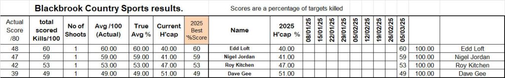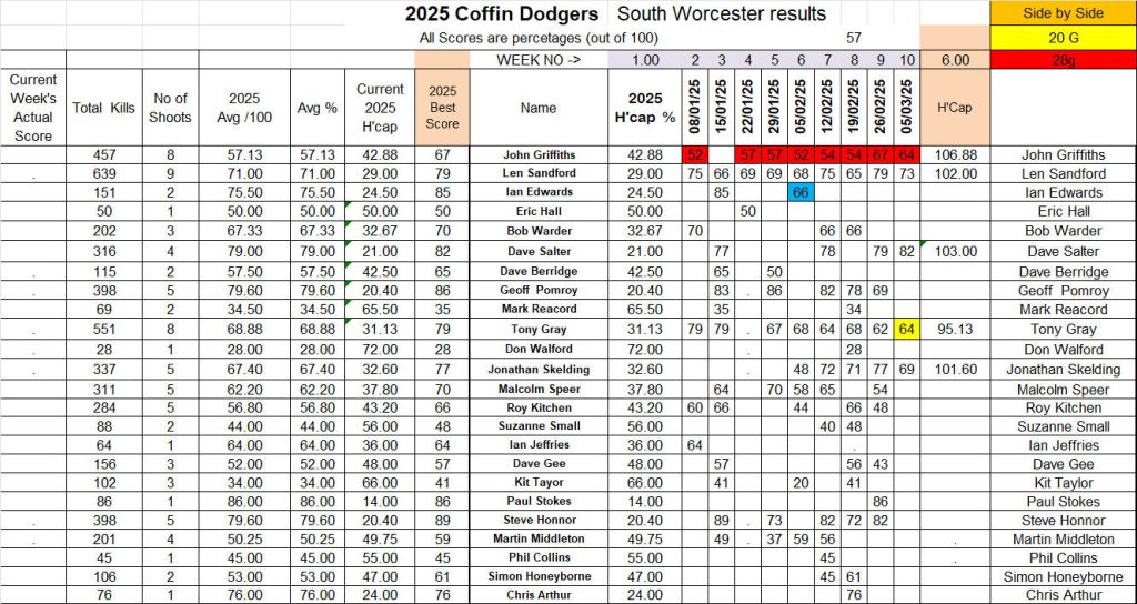 Dave Salter was on his best form and gave us all a couple of hours of free instruction as to how the ground should be shot. His 82 kills gave him the scratch top spot and beat the runner up, (myself, Len) by a mere 9 targets. Jonathan Skelding took the Bronze position another 4 points behind. For the second week running, John Griffiths and his mighty 28 took the Handicap Gold medal, beating Dave’s excellent result by almost 4 extra targets. I scraped the third spot.