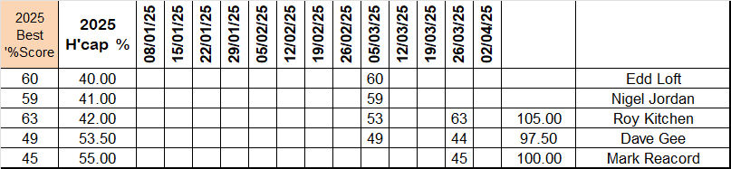 David Gee took a small squad to a more local ground (for him) at Blackbrook shooting ground near Wishaw again last week. The scores indicate that their targets were no pushover either. Roy Kitchen was top gun with a 63% kill rate. Mark Reacord, who was on his first visit, broke 45%. David couldn’t quite match his previous score but still managed 44% kill rate. There are not enough scores to get a good set of handicap results from Blackbrook but Roy Kitchen clearly enjoyed himself by beating his initial score by ten clear points. Well shot Roy.