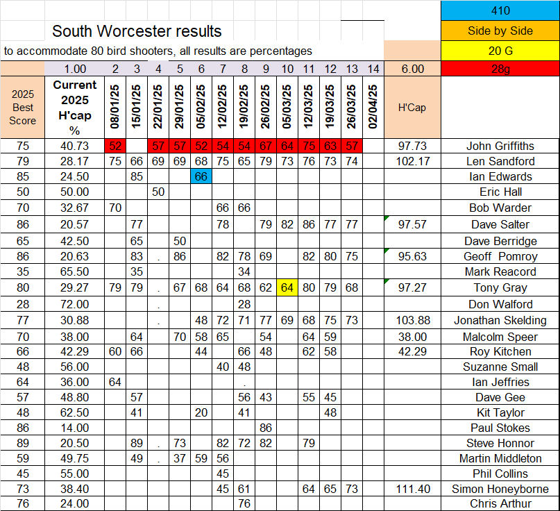 To accommodate 80 bird shooters, scores are percentages