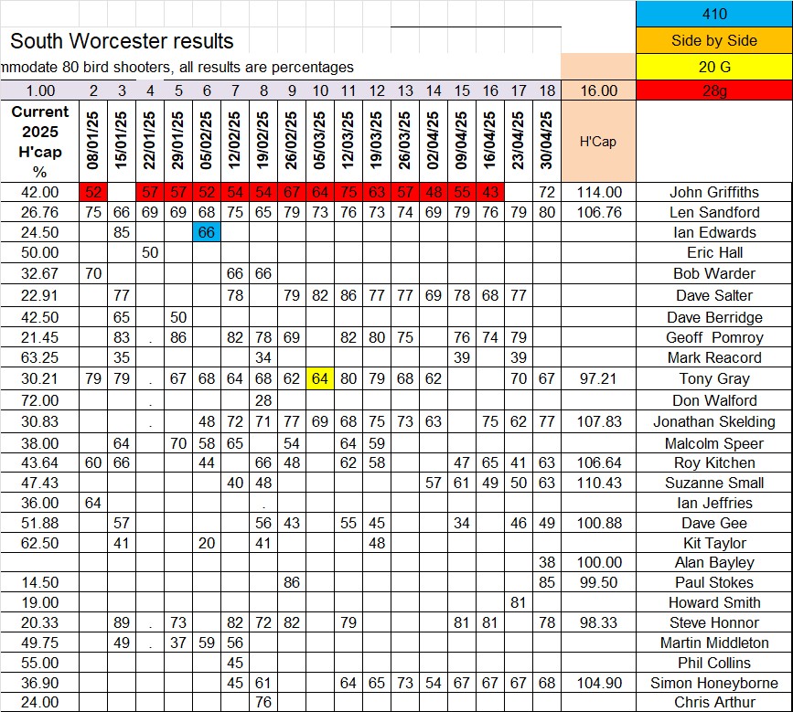 A lovely day for a shoot at South Worcester. Paul Stokes joined us again for only the second time this year and, as usual, gave us all a free shooting lesson. Without a doubt, he is one of the very best shooters I have shared a stand with over the last 25 years. Great to have you back Paul. As usual, he took the scratch top place by a significant margin, beating Len’s 80 by 5 clear points.