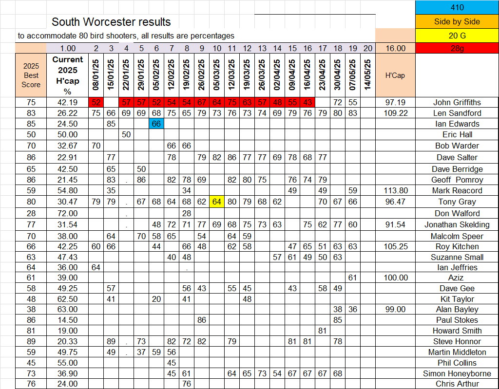Sunshine still seems to be hanging in there and Padstow is starting to look very welcoming to your commentator. A recount on the scorecard gave Len an extra point which meant that his 83 hits beat everyone else on the day by a massive 17 points. Tony Gray came second with 66 broken clays with Roy Kitchen scoring an excellent 63. Mark Reacord’s 59 was his best percentage of the year and won him the Handicap top spot by a clear 4 points. Well shot Mark. Len’s 83 took the second spot on the Handicap list with Roy Kitch’s 63 taking the third place. All in all a very pleasant days shooting.