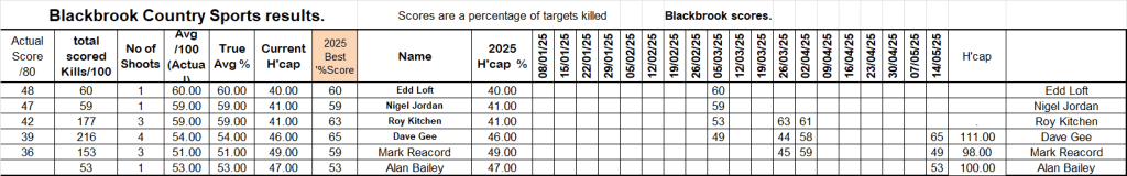 Just 3 results from the Blackbrook ground. Dave Gee found some good form at last and took the top spot in both the Scratch and Handicap ratings with his 65% breakage rate setting himself a new top score of the year and beating his average by a superb 11%. Alan Bayley was scratch runner up with a 53% kill rate. This figure, being his first score at the ground, became his initial handicap benchmark and on the day placed him second on both the scratch and handicap scores. Mark Reacord marginally missed his average and took third place in both the score ratings.