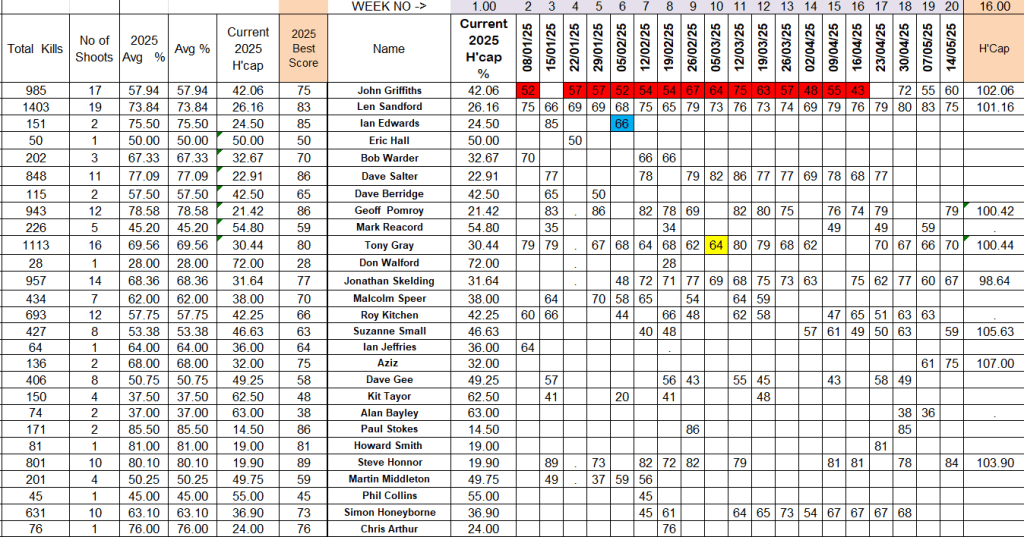 Handicap ratings. Suzanne’s 59% score was over 5% better than her average and easily put her in second place with Steve Honner’s scratch winning score giving him third place on the handicap ratings. With only one shooter not beating his average, this was a fine set of results.