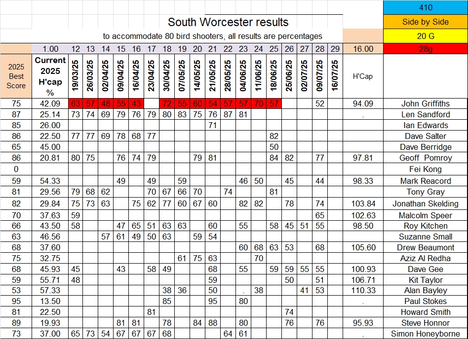 A good set of results last week with one best score equalled by Drew Beaumont and another best score set by Alan Bayley. Well done both. Top scratch score was taken by Geoff Pomroy with 77 broken targets. Steve Honner was just one target behind with 76 and Jonathan Skelding another two targets back on 74. There were some excellent Handicap results with Alan Bayley taking the Gold medal position by beating his average by over 10 points. Great shooting Alan, (your next target is 60%) Runner up was Kit Tayor who beat his average by over 6 points leaving Drew in third place just one target behind.