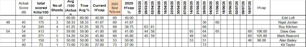 Geoff Pomroy’s 74 filled the third place. Jonathan’s 80 easily took the Handicap top spot with Tony Gray’s 20 bore, around 10 points behind, taking the silver medal place. Kit Tayor’s 50% score earned him third place on the Handicap rating. Well done again Kit.