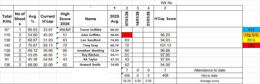 Late with results this week, I’ve been busy re-writing the spread sheet and it took longer than I thought. A miserable set of results with only one shooter beating his average. (I am using last years results to calculate this years initial handicap figures. Tony Gray was top scratch scorer beating Jonathan Skelding by an impressive 6 targets. Len took the bronze position with a miserable, (for him) of 63. Tony also took Handicap Gold spot with Roy Kitchen taking Silver and Kit Taylor filling third place. A poor days results. I hope Jonathan’s skiing next week is more satisfying than his shooting.