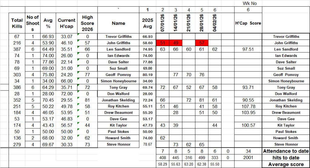 Only God knows how, but Len’s miniscule 62 hits turned out to be the days top scratch score. Fortunately Jonathan Skelding had decided to give us a chance this week and came out with a fresh musket that had the same accuracy characteristics as every one else’s. He only managed 61 hits, which gave him runner up spot, (his worst score since last May). Third place was taken by Roy Kitchen with a 58% that beat Tony Gray’s identical score on Handicap adjustment. Well done Roy. Roy easily took the Handicap Gold medal with a result that beat Drew Beaumont, his nearest rival, by almost 4 targets. Kit Taylor took the Handicap Bronze position. A great set of resuts from the morning squad. They alone beat their average scores. Great shooting on a difficult layout.
