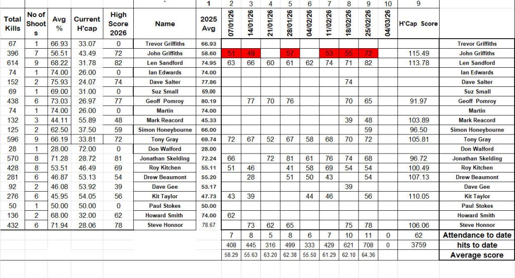 Becky let us off light again this week with an excellent set of mainly hit-able targets being presented. Two of our best shots failed to beat their average scores while virtually everyone else put in some super ones. Len Sandford put in his best score ths year with 82 hits and took the scratch top spot. Runner up was Steve Honner just 4 targets behind. John Griffith’s mighty little 28g equalled Tony Gray’s 72 but stole the scratch third place on Handicap adjustment. Great shooting John. The 28g also beat all-comers to the Handicap Gold medal spot with a score over 14 points better than his average. Len was runner up, less than 2 points behind with Kit Taylor returning another best score of the year for the second time in his last two visits. A great improvement Kit, Hope the gun-fit goes ok and finds you even more. A very satisfying shoot.