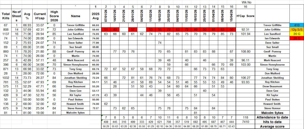 Geoff Pomroy broke 87 clays beating his 80% mark for his fifth consecutive shoot. He is certainly setting himself a high score benchmark that few of us can get near just lately. Top scratch gun again Geoff, well done. Jonathan Skelding was runner up with 80 shattered targets leaving Len’s 73 to take the scratch Bronze position, Geoff’s mighty 87 also scooped the Handicap top spot by 2 and a half points from Jonathan. Handicap 3rd place went to Simon Honeybourne, anothr 3 points behind. All easily beat their handicap average with special credit to SImon who has been steadily improving for many weeks. Great work Simon, Keep it up.